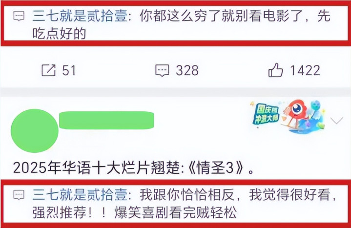 而对此,有东谈主狠狠“破防”了,在评述区思方设法的为电影挽尊,从被心理的列表来看,很有可能是《情圣3》的制片东谈主之一。
