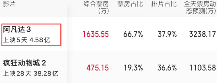 前有《纵脱动物城2》狂揽38亿票房,随后《阿凡达3》成效接棒,上映后票房势如破竹,5天狂轰4.5亿。
