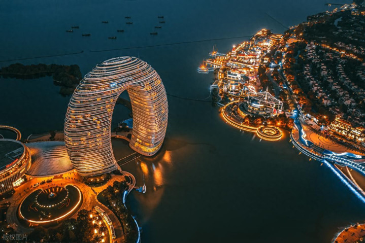 远远能看到月亮酒店,圆环照着湖水,拍照不费钱,住要看预算。