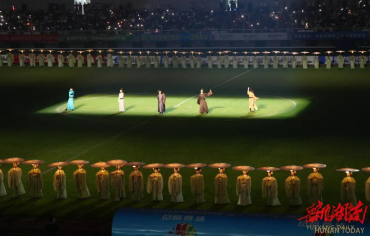当上半场截至哨吹响时,涌现场内,灯光骤暗,滕子京穿越时空,现身球场。一声“不以物喜,不以己悲”的领诵,将千古绝唱《岳阳楼记》洒向夜空,短暂叫醒全场2万名不雅众的历史缅念念……这,很岳阳!